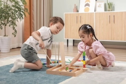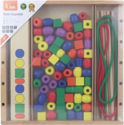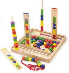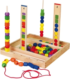 I bambini compongono e infilano le perline sui pioli nell'ordine indicato dalle carte. Allenano la coordinazione occhio-mano, la pazienza e il riconoscimento di colori e forme.