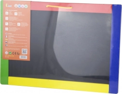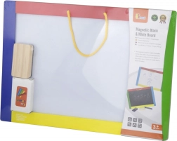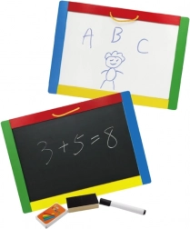 Questa lavagna versatile unisce due superfici creative in un unico prodotto – lato nero magnetico per i gessetti e lato bianco cancellabile per il pennarello. I bambini possono scrivere, disegnare ed esercitarsi con lettere e numeri; sul lato nero si possono inoltre applicare facilmente le calamite. Nella confezione trovi tutto il necessario per un uso immediato: 4 gessetti, un pennarello cancellabile e una spugnetta.