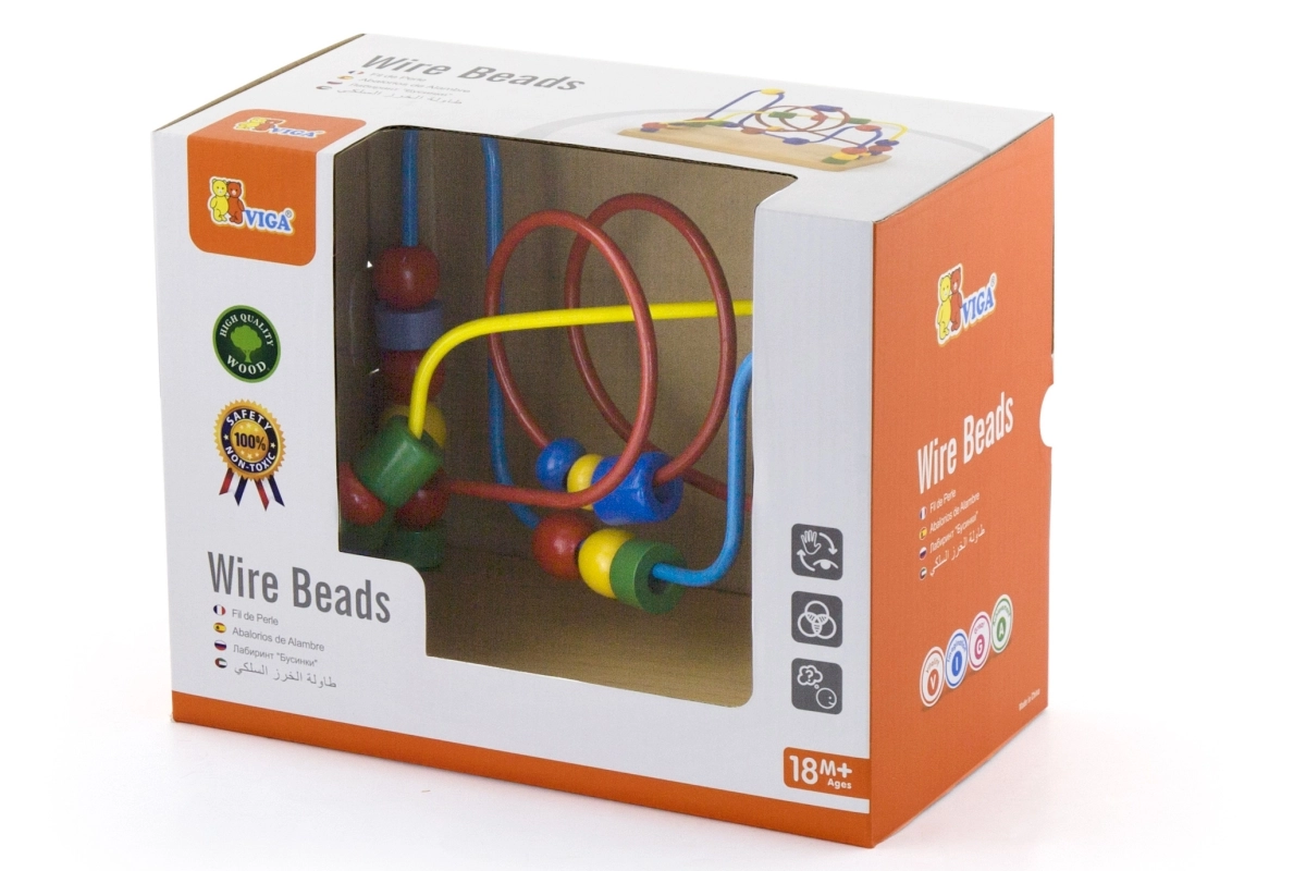 Le perline colorate su percorsi sinuosi motivano i bambini a spostare e ordinare, sviluppando così la presa, la coordinazione mano–occhio e la pazienza.
