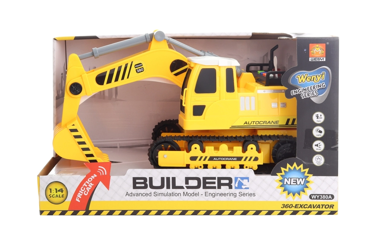 Escavatore da costruzione a batteria (incluse nella confezione). Premendo i pulsanti, l'escavatore si illumina e emette suoni. Ha una benna mobile. Dimensioni dell'escavatore circa 30 x 13 cm. Età 3+