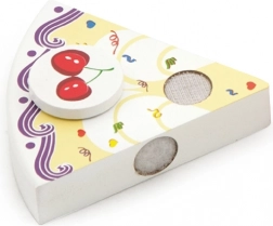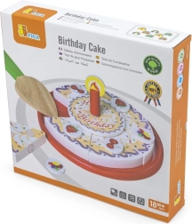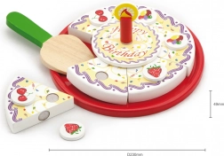 La torta di compleanno in legno su vassoio è suddivisa in spicchi con decorazioni e candela. Grazie al velcro/magneti (a seconda della versione) i pezzi si separano e si ricompongono facilmente. I bambini esercitano la presa, la precisione e il vocabolario durante il gioco condiviso del “soffiare la candela” e del servire.