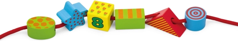 Questo set di infilatura in legno offre ai bambini infinite possibilità di creazione: infilare come perline, costruire torri e casette o ordinare per colori e forme. I pezzi grandi (circa 4 cm) sono facili da impugnare e ideali per i primi esercizi motori.