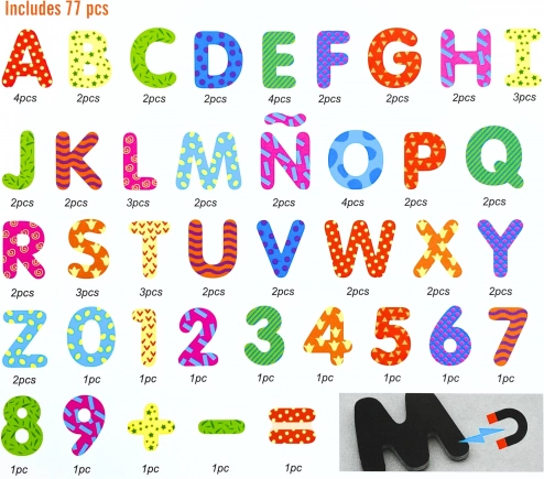Gli elementi aderiscono alla lavagna magnetica, al frigorifero o ad altre superfici metalliche. Perfetti per l’esercizio quotidiano e il gioco libero.
