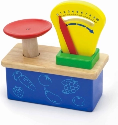 Questa robusta bilancia in legno introduce i bambini in modo divertente a pesi e numeri. Con una semplice pressione del piattino di pesatura la lancetta si muove e sul quadrante compaiono i valori: i bambini comprendono così facilmente le basi di misurazione ed equilibrio. Grazie ai colori allegri e alla scala chiara, la bilancia è un ottimo complemento per la cucina dei bambini e per l’angolo del negozio.