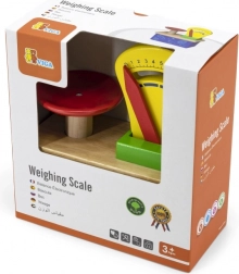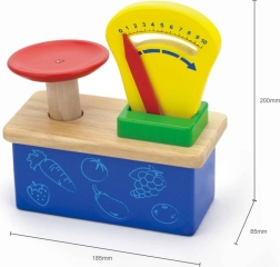 La bilancia ha dimensioni pratiche ca 18,5 × 20 × 8,5 cm, è comoda da impugnare ed è realizzata in una combinazione di legno e plastica resistente. È sicura dai 3 anni e favorisce fantasia, motricità fine e abilità sociali.