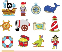 - Motivi pirateschi: nave, pirata, timone, tesoro e altri elementi colorati per il gioco a tema.