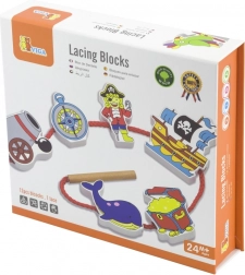 Divertente set a tema pirati per i più piccoli che sviluppa motricità fine, coordinazione occhio–mano e creatività. Contiene 12 blocchi di legno e un lungo laccetto per infilare, confezionato in una pratica scatola che funge da box contenitore. Adatto da 24 mesi.