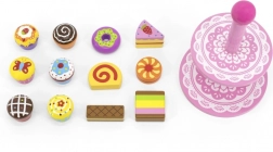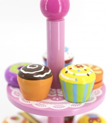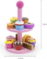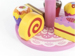 Questo elegante set di dessert in legno su alzatina a due piani è ideale per il gioco del caffè, il tè delle cinque o la pasticceria dei bambini. I pezzi in legno ben rifiniti e dai colori vivaci invitano alla scoperta e allenano la coordinazione occhio–mano.