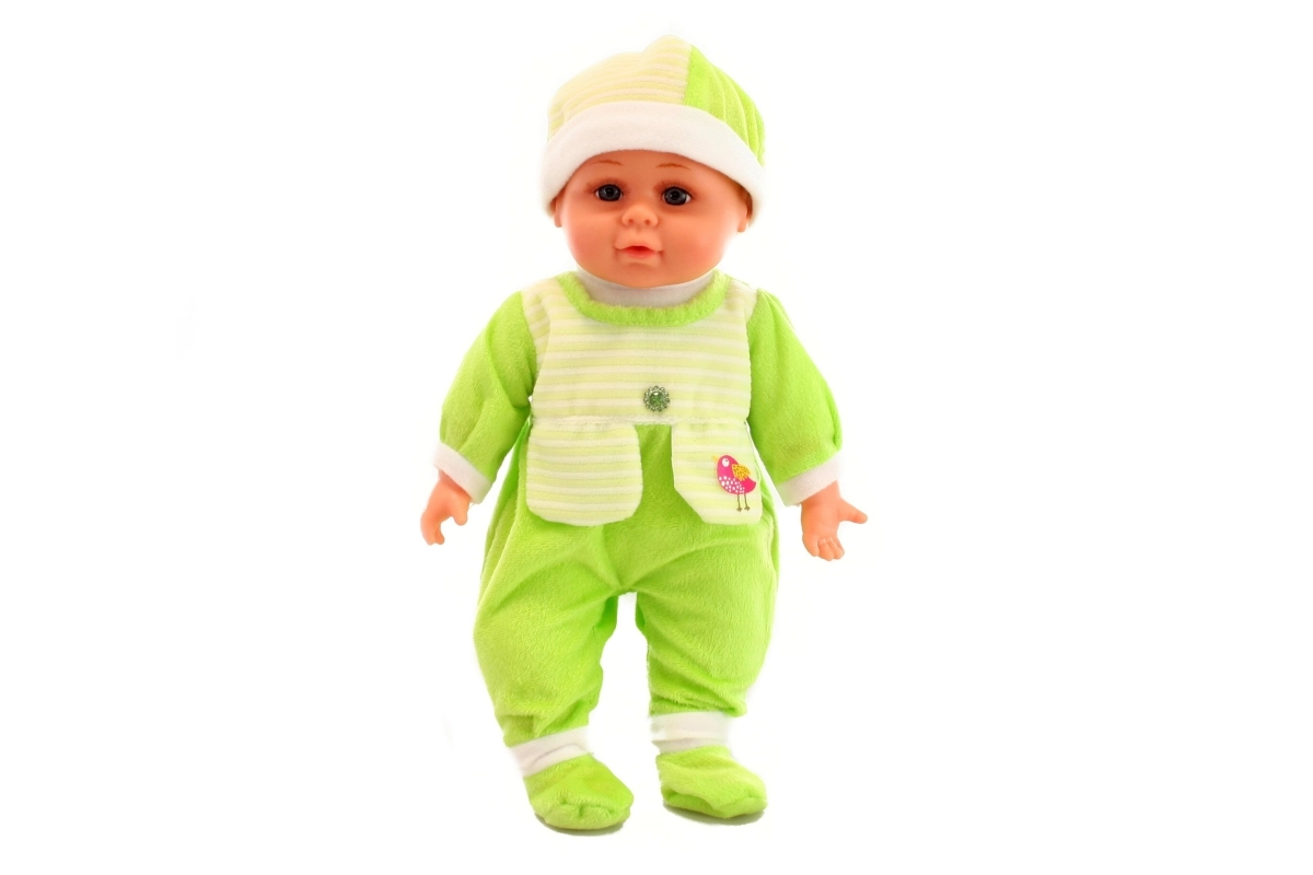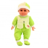 Dolcissimo bambolotto con corpicino morbido che farà felice ogni piccolo caregiver. Premendo il corpo emette suoni realistici – risata, pianto, “mamma” e “papà”. La bambola indossa un pigiama colorato con chiusura a strappo, facile da togliere e rimettere.
