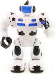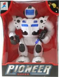 Robot a batterie che cammina, si illumina ed emette suoni, muove le braccia e la testa. Alimentazione con 4 batterie AA (non incluse). Dimensioni del robot circa 23 x 17 cm. Età 3+