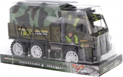Realistica auto militare con telone, lunga circa 23 cm, entusiasmerà i piccoli appassionati di mezzi. Il telone è fissato con elastici e può essere rimosso facilmente. L'auto si muove a inerzia per un gioco divertente senza batterie. Giocattolo ideale per bambini dai 3 anni in su.