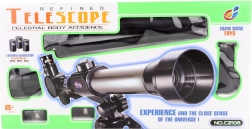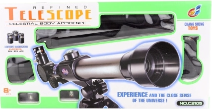 Telescopio in plastica con treppiede. Diametro dell’obiettivo 60 mm, distanza di messa a fuoco 170 mm, ingrandimenti 20x, 30x e 40x. Dimensioni della confezione circa 43 x 22 x 8 cm. Età 8+