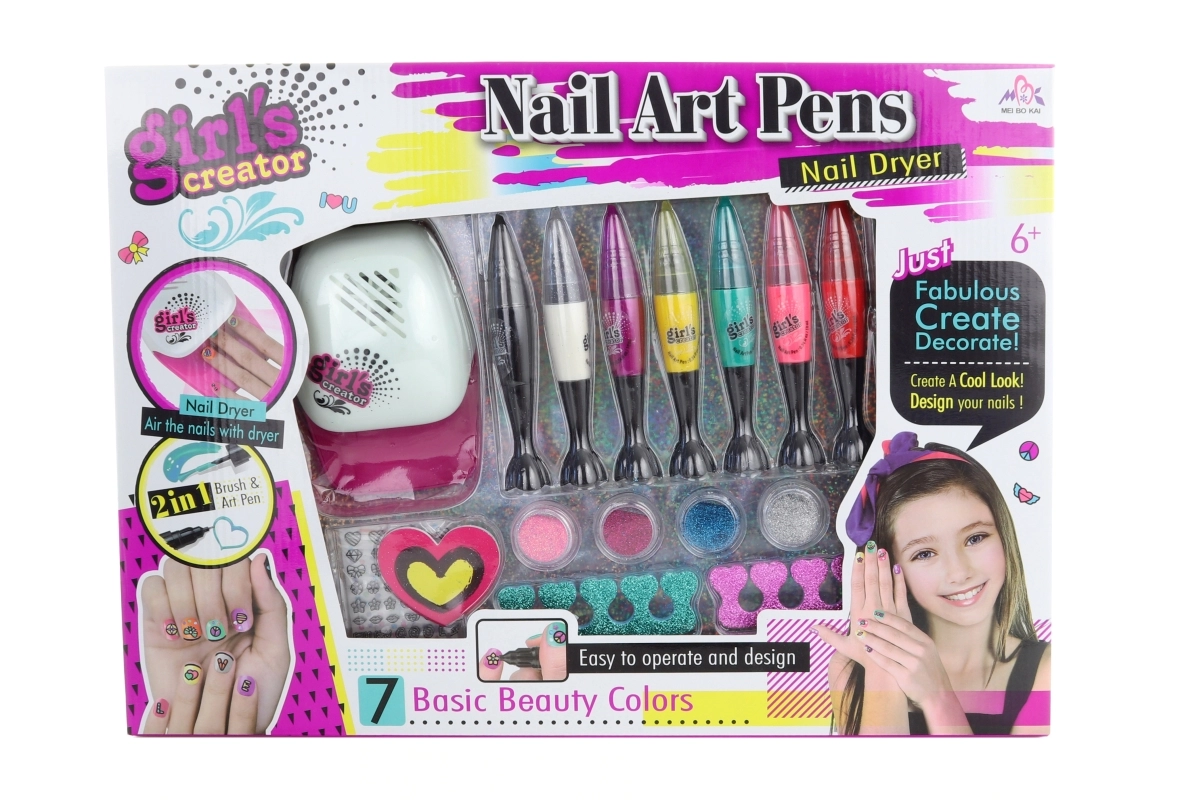 Crea a casa una vera opera d’arte per le unghie con il set creativo completo per piccole stiliste. Il set include 7 smalti colorati con applicatore doppio (pennellino e penna), una asciugatrice per unghie a 2× batterie AAA, una lima, separatori per dita, polveri glitter e adesivi colorati. Ideale per bambini dai 6 anni.