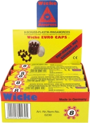 Affidabili cartucce a capsule a forma di corona per pistole giocattolo con caricatore a otto colpi. Un rullo contiene 5 box (in totale 240 colpi) ed è confezionato in una pratica scatolette di plastica. Ideale per il gioco divertente, consigliato dai 3 anni.