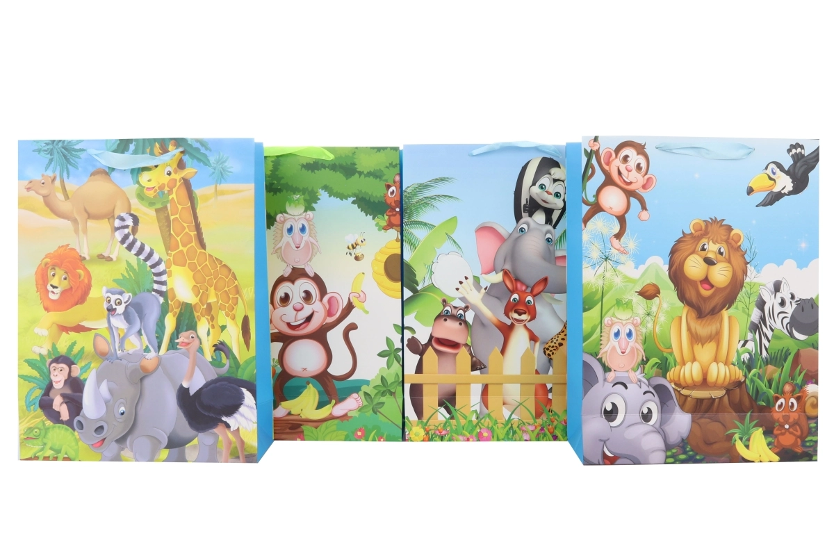 Elegante borsa regalo con motivo safari in formato grande che farà felice ogni destinatario. Grazie alle dimensioni di circa 50 × 40 cm, può contenere anche regali più voluminosi e la struttura robusta garantisce un trasporto comodo e sicuro. Scelta perfetta per compleanni, festività e altre occasioni. Disponibile in 4 diversi design a tema safari.