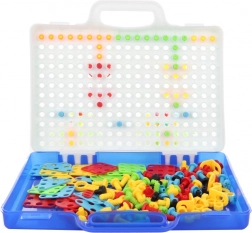 Tutto è riposto nella valigetta portatile con coperchio che funge da pegboard, così il set si trasporta e si riordina con facilità. Un ottimo strumento per sviluppare motricità, coordinazione occhio–mano, creatività e pazienza.