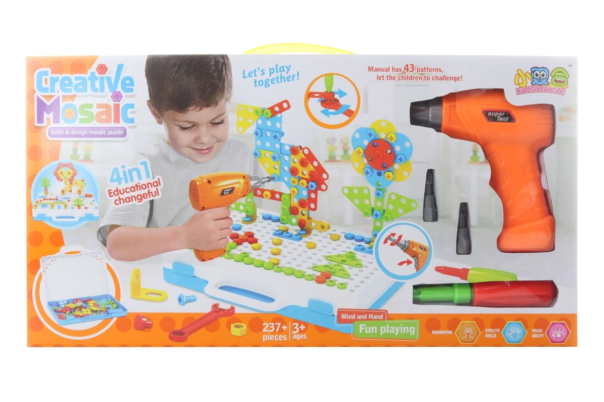 Questo set a viti è ideale per i piccoli costruttori che amano creare e assemblare. I pezzi di varie forme e colori si montano facilmente sulla tavola con fori tramite viti in plastica, sia manualmente con il cacciavite sia con la trapano avvitatore per bambini alimentata da 2× batterie AA (non incluse).