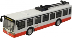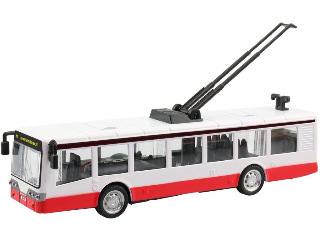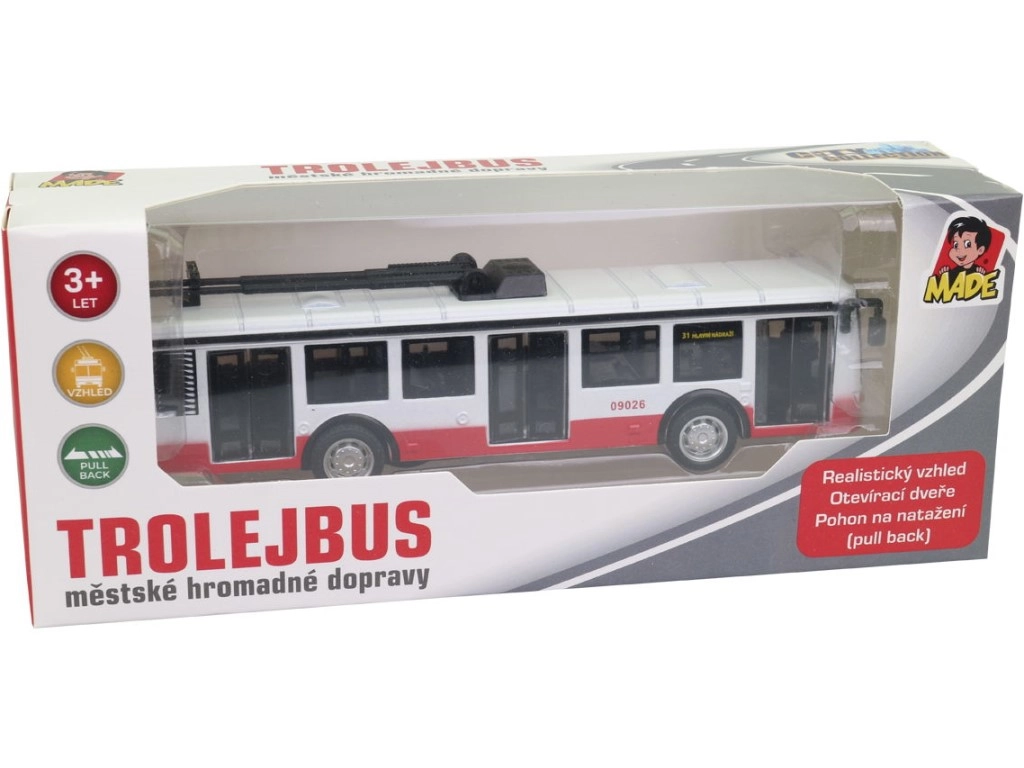 Scopri un filobus dettagliato nella tradizionale combinazione di colori rosso-bianco-nero, come quelli di alcune città ceche. Il modello è realizzato in metallo di qualità con elementi in plastica, risultando al contempo robusto e leggero per le mani dei bambini. Grazie alla retrocarica, il filobus parte da solo dopo essere stato rilasciato, offrendo tanto divertimento.