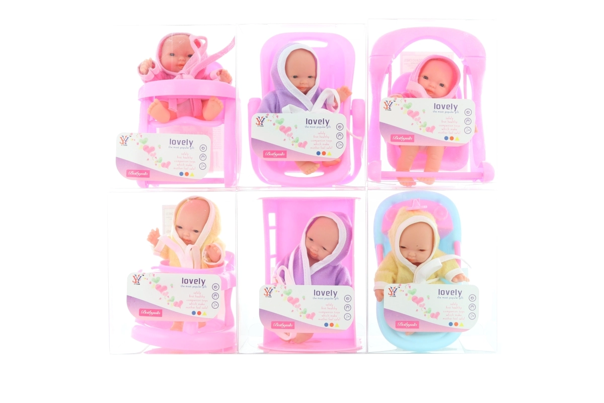 Dolce bambolotto con vari accessori per un gioco creativo. Ogni bambolotto ha il proprio accessorio (seggiolina, vasca, lettino, girello ecc.) e un completino, ideale per i piccoli caregiver. Dimensioni compatte di circa 10 cm, perfette per la mano dei bambini. Adatto ai bambini dai 3 anni.
