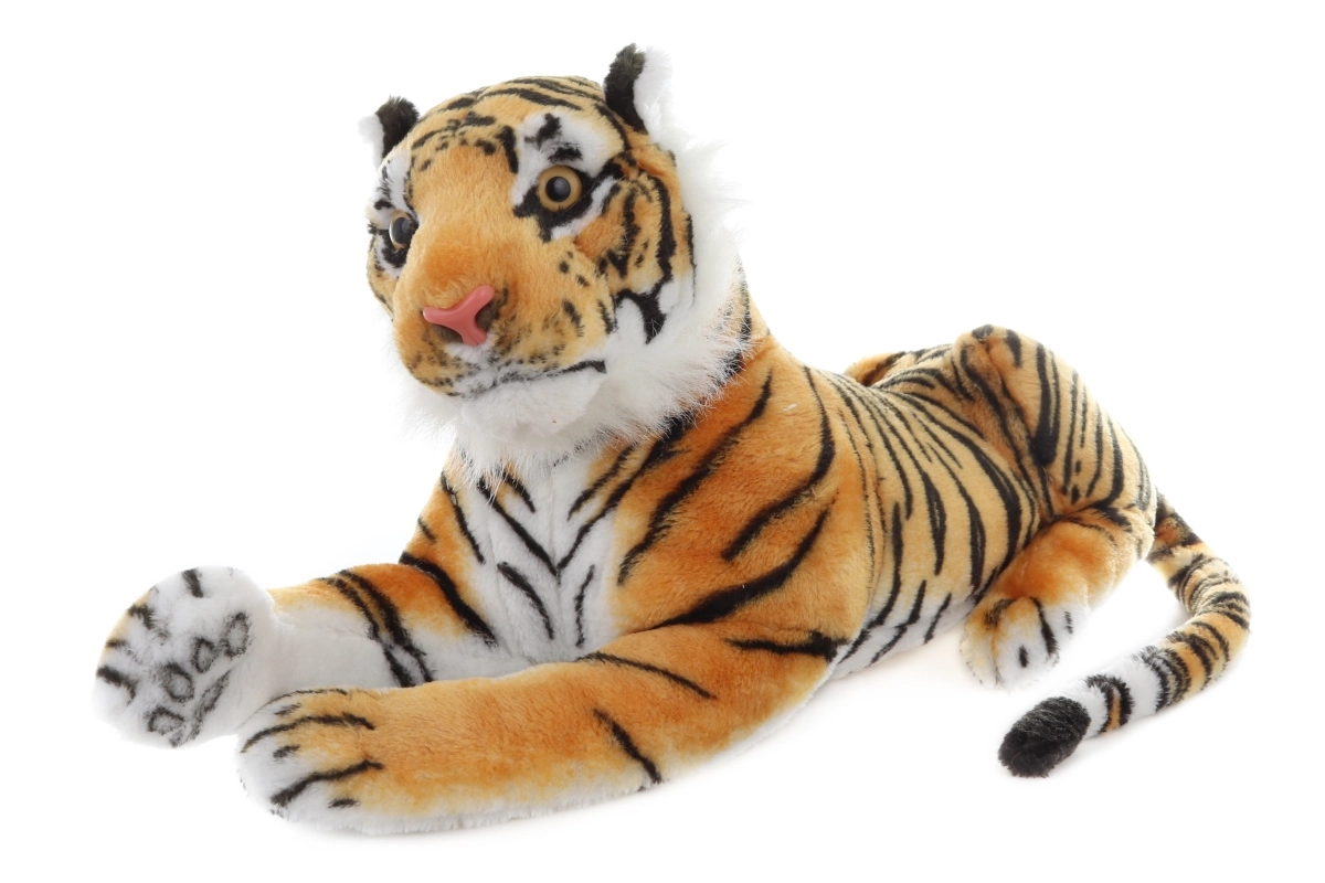 Adorabile e morbidissima tigre di peluche lunga 55 cm, compagna ideale per bambini di tutte le età. Offre una struttura soffice, dettagli realistici e una lavorazione sicura adatta a età 0+.