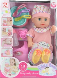 Dolcissima bambola per bambini dai 3 anni che, con le batterie inserite, emette suoni realistici e sa fare pipì. Inclusi ricchi accessori: scarpette, bavaglino in plastica, biberon e piattino. Ideale per imparare a prendersi cura del bebè e stimolare la fantasia.