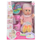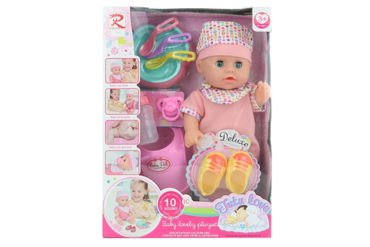 - bambola, scarpette, bavaglino in plastica, biberon, piattino e altri accessori
