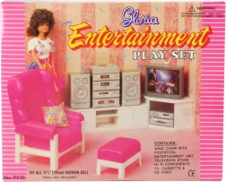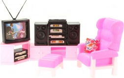 Il set è realizzato in plastica resistente e comprende una comoda poltrona con poggiapiedi, una pratica parete soggiorno con sportelli, un mobile angolare e l’attrezzatura multimediale. Le dimensioni compatte dei singoli elementi facilitano la manipolazione e la conservazione.
