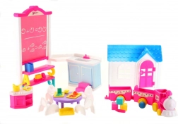 - Accessori ricchi: lavagna con scaffali, lavandino, casetta, tavolino, 4 seggioline, fornellino, trenino con 3 vagoni e piccoli accessori.
