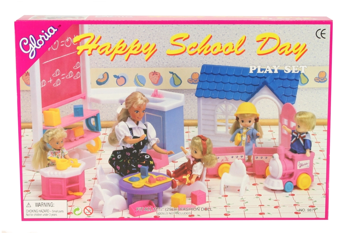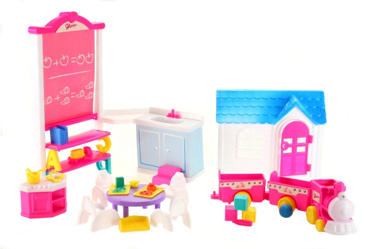 Amplia il mondo del gioco con il set completo Glorie asilo, che include una grande lavagna con scaffali, un lavandino, una casetta con sportellini apribili, seggioline e tavolino per bambini, un fornellino, un trenino con tre vagoni e tanti accessori e stoviglie. Ideale per sviluppare fantasia, abilità sociali e motricità fine. Le bambole non sono incluse.