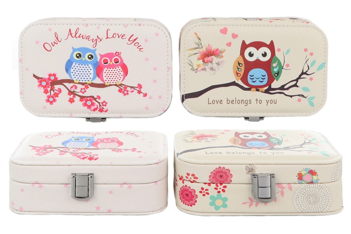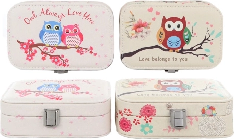 Adorabile portagioie con motivo di gufetta, ideale per piccole signorine. All'interno troverai uno specchietto e tre pratici scomparti per riporre in modo ordinato piccoli gioielli e tesori. Le dimensioni compatte ca. 15 × 10 × 5 cm lo rendono un ottimo accessorio sia per la mensola sia per i viaggi. Adatto dai 3 anni.