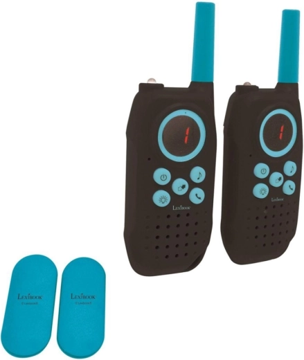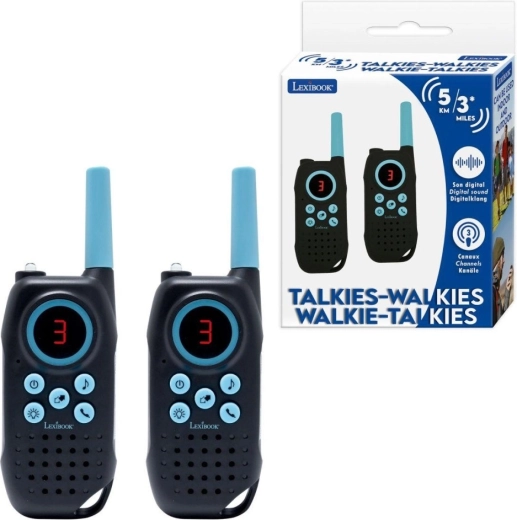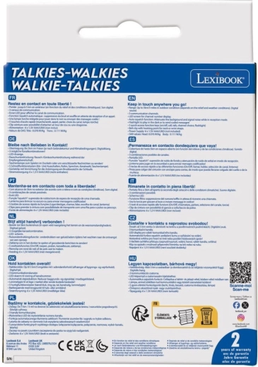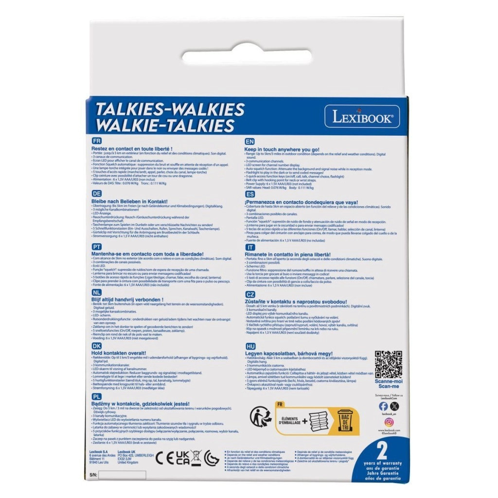 I comandi sono semplici e chiari: pulsante On/Off, pulsante parla, tono di chiamata, selezione canali e luce LED per giocare al buio o inviare segnali luminosi. La funzione squelch filtra il rumore indesiderato, l’audio digitale garantisce chiarezza e il display LED mostra in modo chiaro il canale selezionato. La clip da cintura removibile facilita il trasporto.