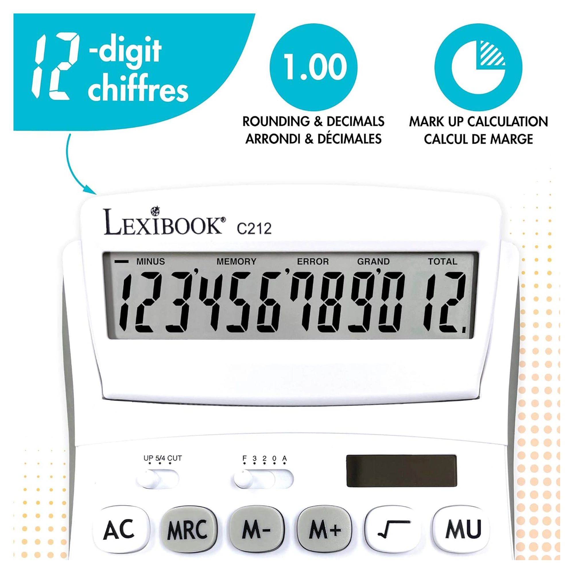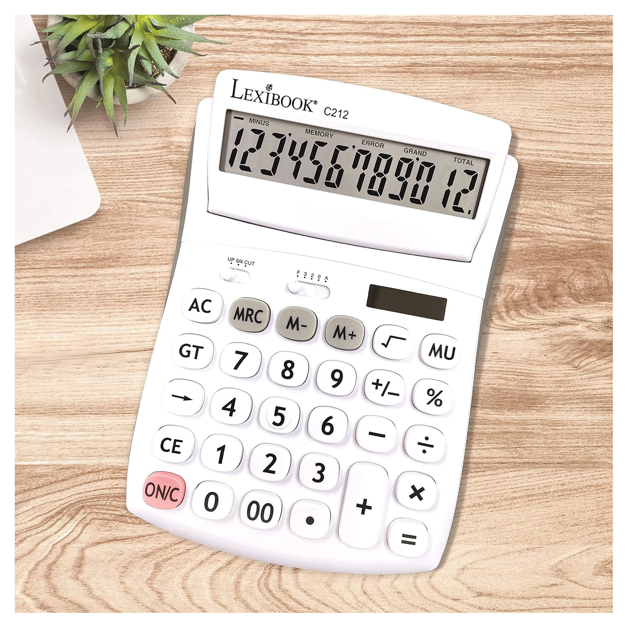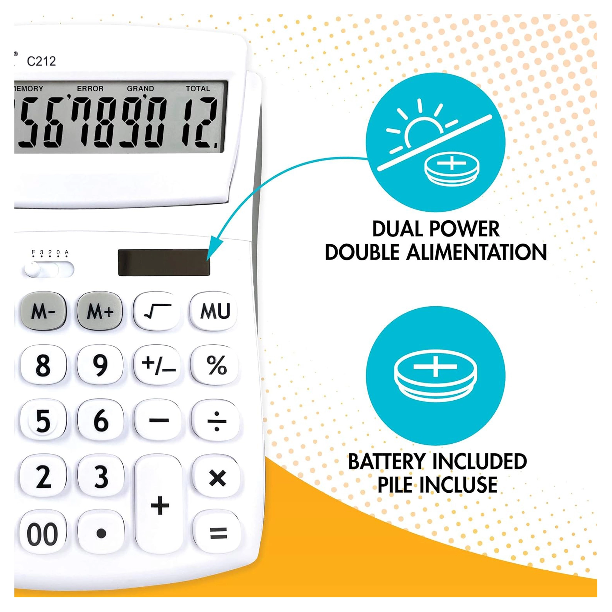 Pratica calcolatrice da tavolo a 12 cifre per ufficio, scuola e casa con ampio display ribaltabile, tasti gommati resistenti e alimentazione duale (batteria AG10 + solare). Consente la selezione delle cifre decimali e l’arrotondamento, dispone di memoria per 3 numeri, funzioni di percentuale, radice quadrata e calcolo del margine e include un tasto di correzione per cancellare le ultime cifre.