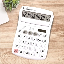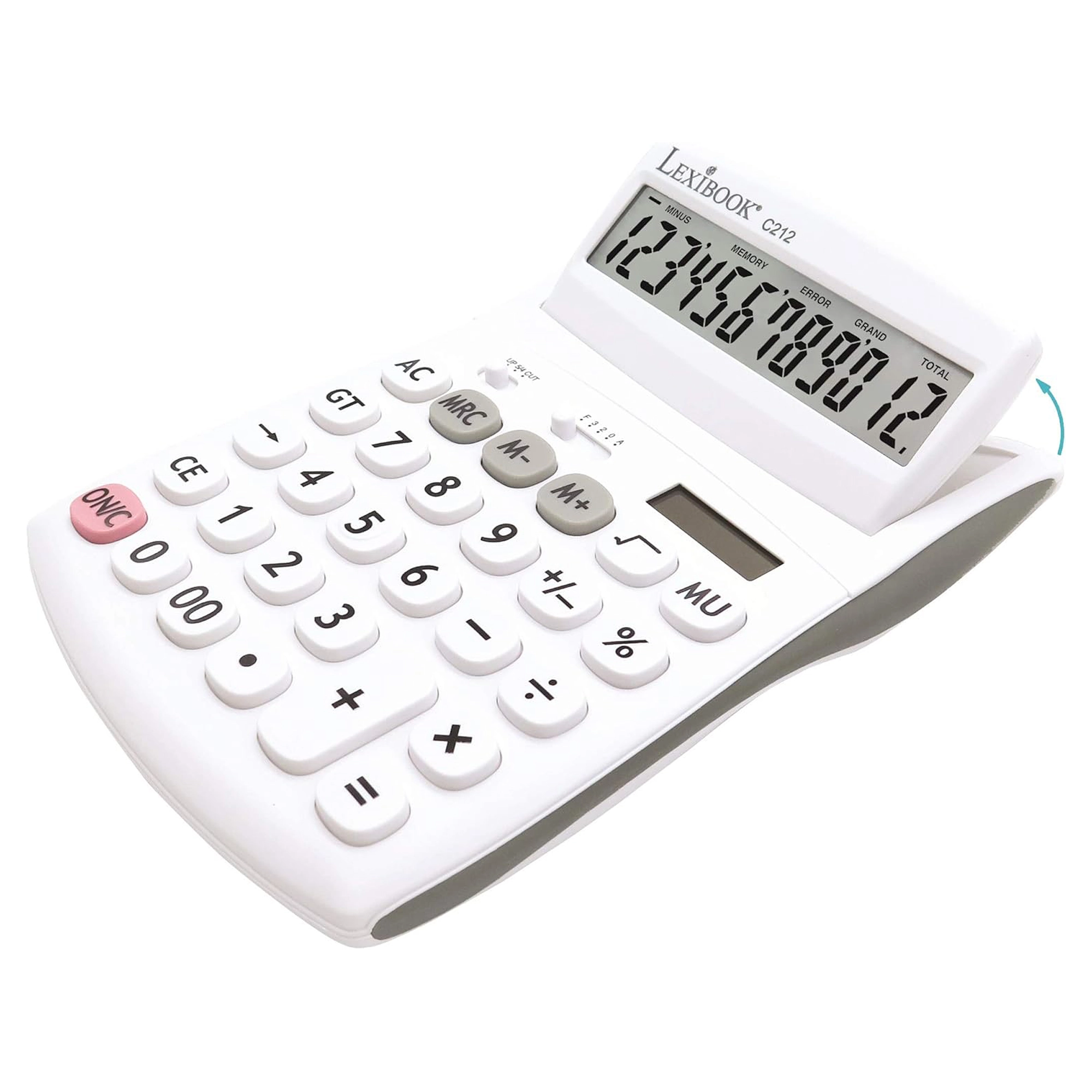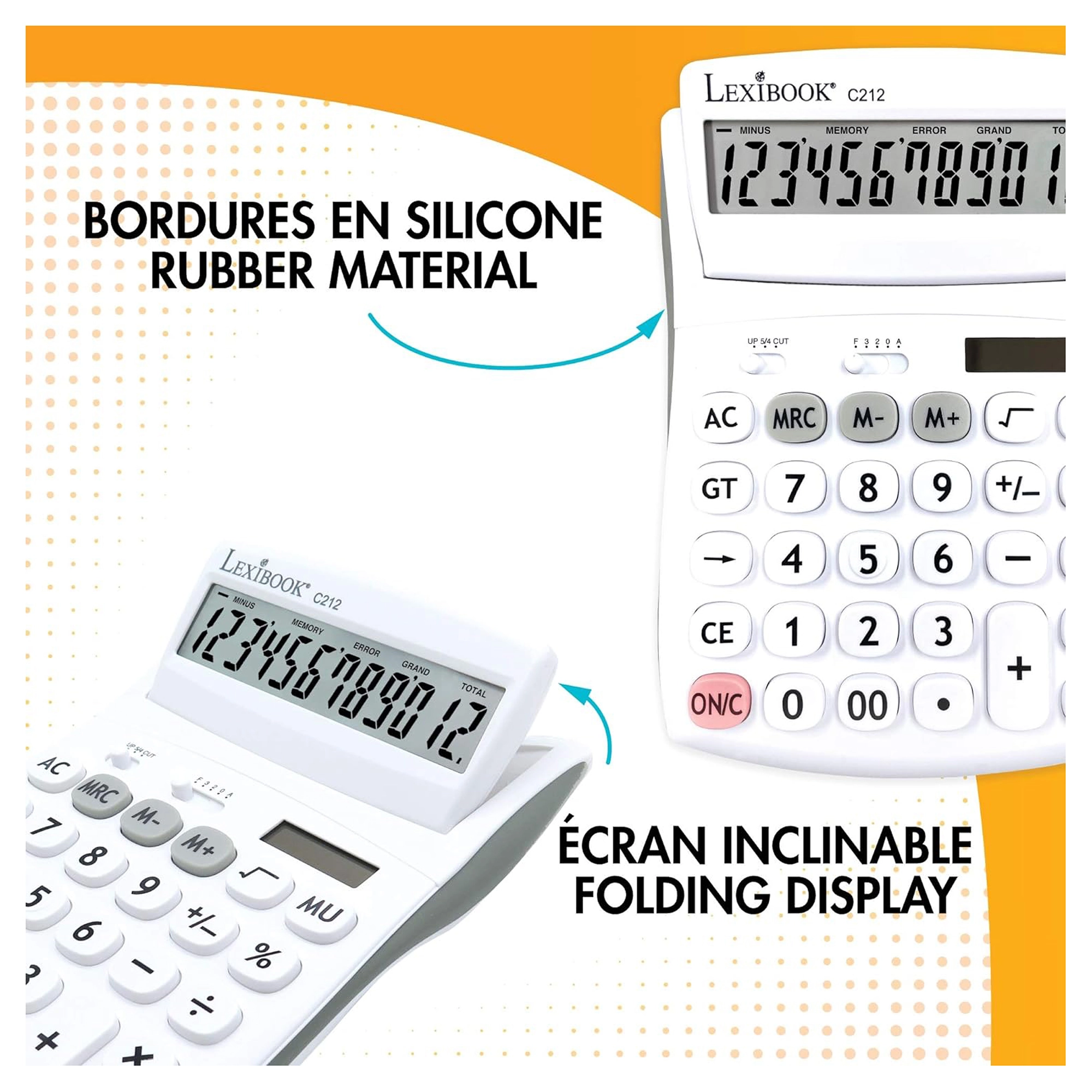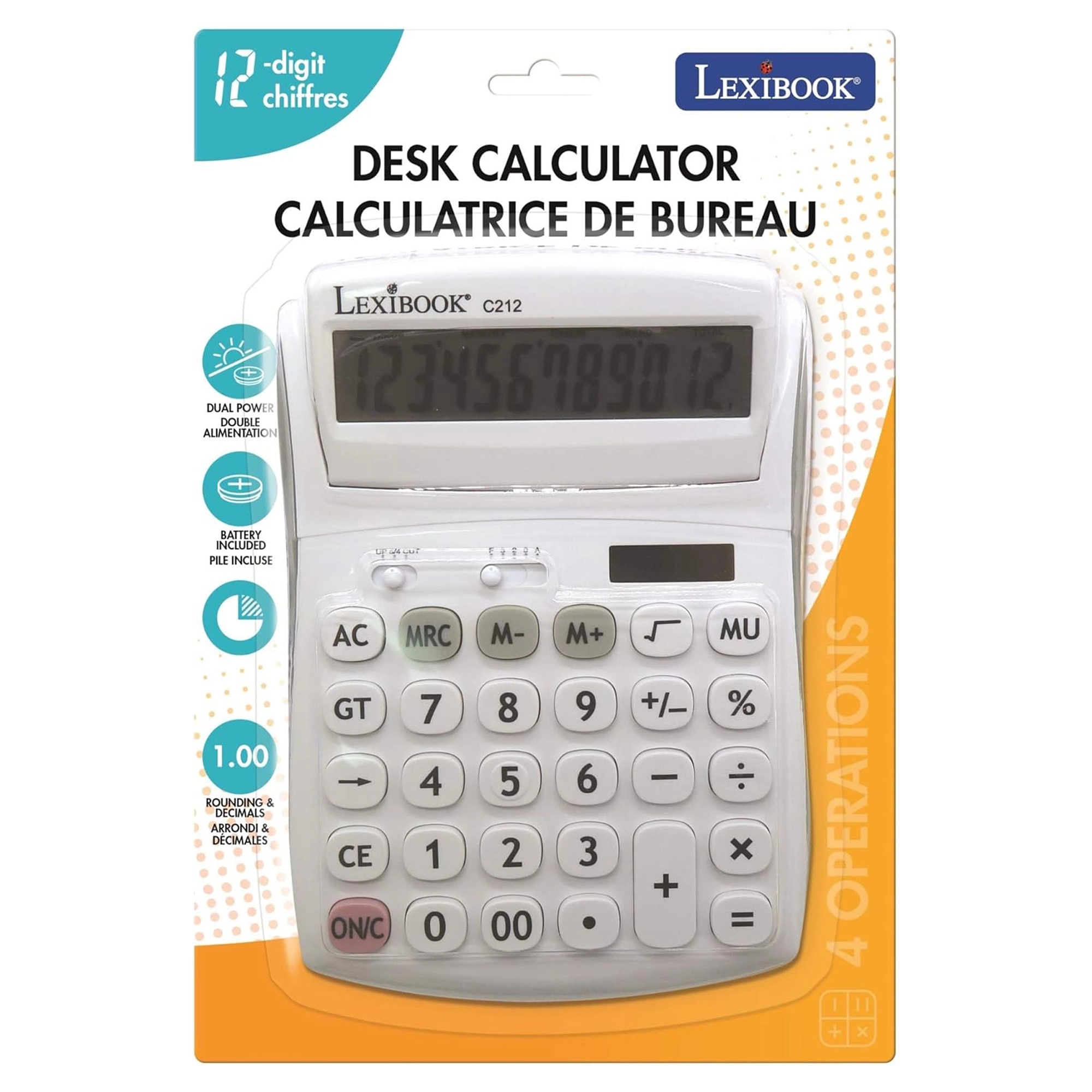 Pratica calcolatrice da tavolo a 12 cifre per ufficio, scuola e casa con ampio display ribaltabile, tasti gommati resistenti e alimentazione duale (batteria AG10 + solare). Consente la selezione delle cifre decimali e l’arrotondamento, dispone di memoria per 3 numeri, funzioni di percentuale, radice quadrata e calcolo del margine e include un tasto di correzione per cancellare le ultime cifre.
