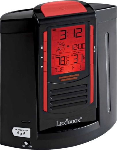 L'elegante radiosveglia LEXIBOOK combina un ampio display retroilluminato rosso, la visualizzazione di ora, data, temperatura e umidità e un umidificatore d'aria integrato per un clima più confortevole in camera da letto. Grazie alla radio e all'alimentazione a batterie AA, puoi posizionarla ovunque senza necessità di presa elettrica.