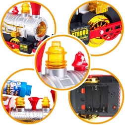 La combinazione di rosso, argento e oro con elementi decorativi e una marcia scorrevole rende il trenino una giocattolo accattivante.