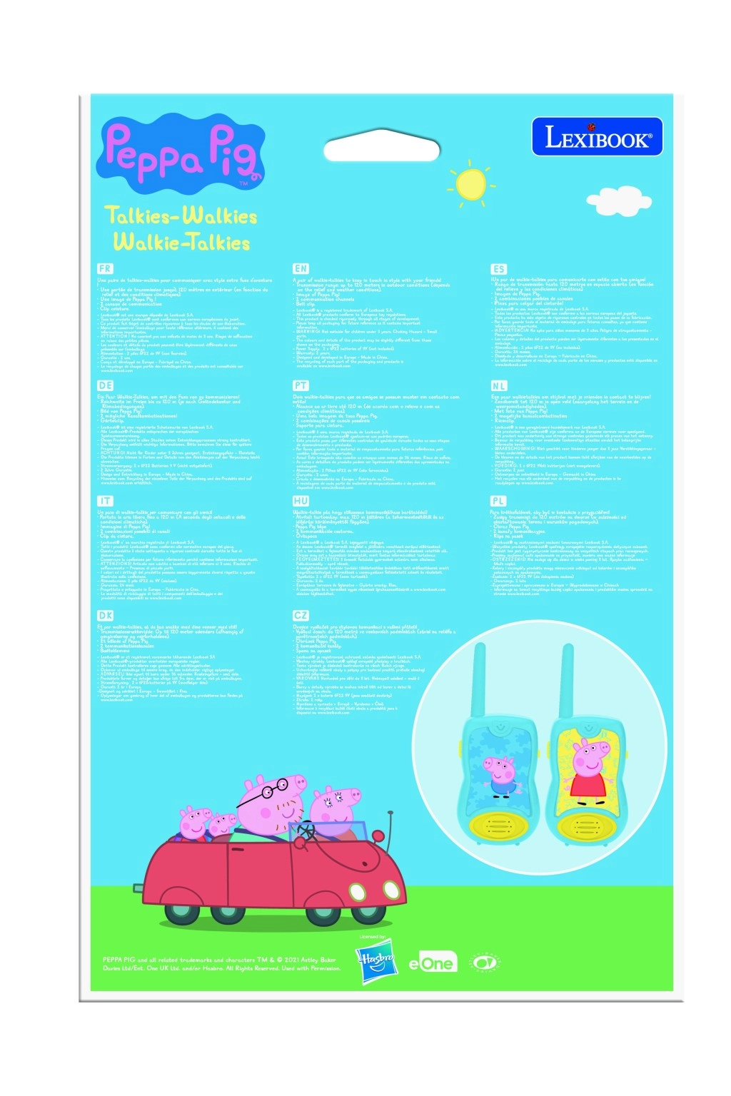 Rimanete in contatto in ogni avventura con le ricetrasmittenti per bambini PEPPA PIG. Offrono una portata fino a 120 metri (a seconda del terreno e del meteo), uso semplice con il pulsante “TALK”, design ergonomico per piccole mani e audio digitale chiaro. Grazie all’antenna flessibile e alla clip removibile per cintura sono ideali per giochi da spie e uscite all’aperto.
