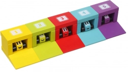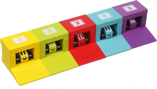 Cinque macchinine colorate e un set di blocchi trasformano ogni giorno in gare emozionanti – dalla partenza ai box fino al garage.