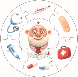 Il puzzle rotondo con la figura del medico aiuta i bambini a riconoscere le principali forniture sanitarie – dallo stetoscopio al termometro – e sviluppa il loro vocabolario e l’associazione logica.