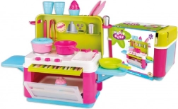 Questa cucina da banco è ideale per i viaggi e per le camerette più piccole. Grazie a due piani laterali portanti e rimovibili offre più spazio di gioco e si trasporta facilmente. Include forno con teglia, piano cottura, lavello con rubinetto e un ricco set di stoviglie: tutto per un gioco di cucina realistico.