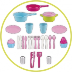 - Contenuto della confezione: set di posate per 4 bambini, cassetto portaposate, forno con teglia, piano cottura, lavello con rubinetto, 3 pentolini, 2 bicchieri, 2 piattini, 2 pinze, saliera, pepiera e 2 cupcake