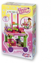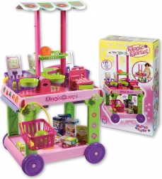 - Carrello mobile con tettoia rimovibile, bancone laterale estraibile, 4 cestini con manico, cassa con monete, bilancia con piattini, 12 pezzi di frutta e verdura, 8 scatoline di prodotti