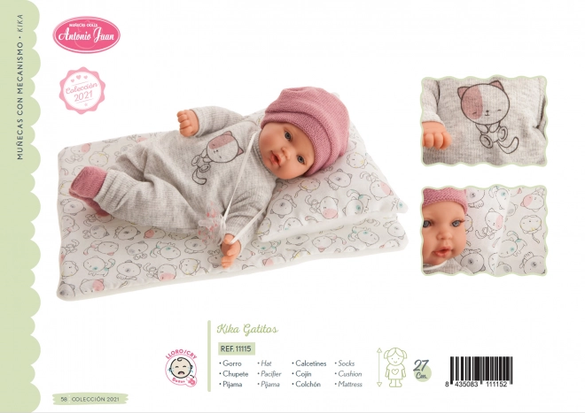 La bambola Kika conquisterà tutte le piccole persone premurose con il suo aspetto realistico e la piacevole fattura. Quando si rimuove il ciuccio dalla bocca, inizia a piangere; può essere calmata riapplicando il ciuccio magnetico. Il corpo morbido in tessuto è ideale per essere abbracciato, mentre testa e arti sono in vinile morbido di qualità con finiture dettagliate.