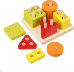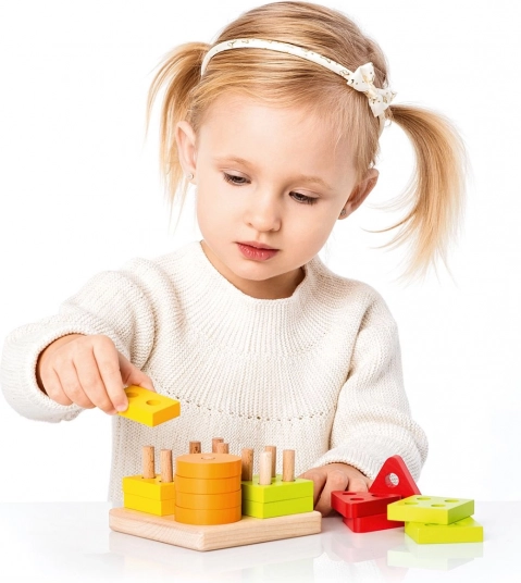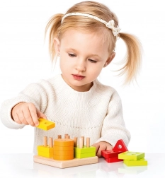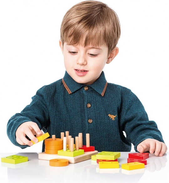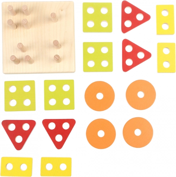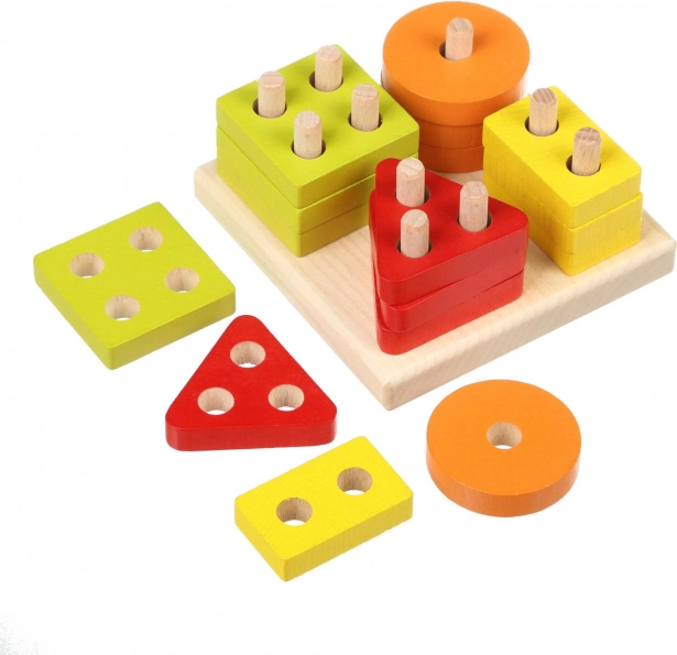 Cerchi, quadrati, triangoli e rettangoli colorati con fori si inseriscono sui pioli della base. I bambini classificano naturalmente per forma e colore, allenando il pensiero logico.