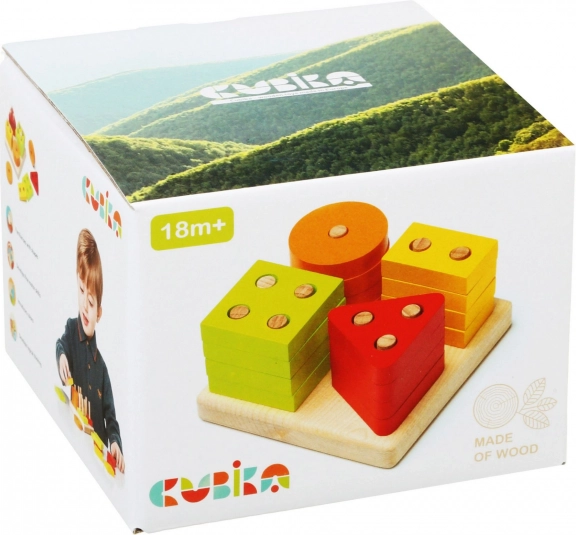 Il gioco didattico per bambini CUBIKA Classifichiamo le forme include 16 pezzi geometrici colorati e perforati e una solida base quadrata con pioli. I bambini scoprono naturalmente le differenze tra forme e colori, allenano la presa e la coordinazione occhio–mano e sviluppano immaginazione e pazienza. L'accurata lavorazione in legno di acero e faggio e le vernici a base d'acqua, resistenti e sicure, garantiscono lunga durata e gioco in sicurezza.