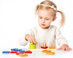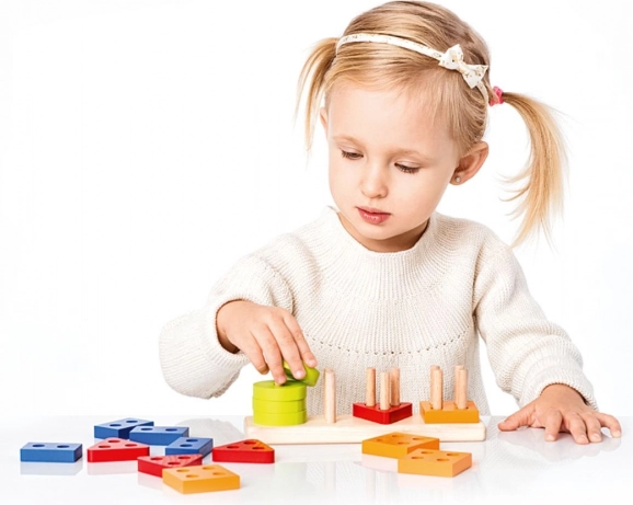 Infilare i pezzi sui piolini rinforza la coordinazione occhio–mano, la precisione della presa e la concentrazione – competenze chiave per l’età prescolare.