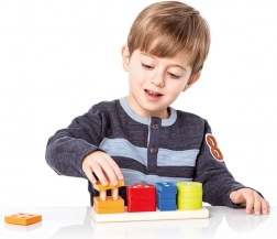 Questo puzzle in legno di alta qualità offre 16 forme geometriche colorate da infilare sui piolini di una base rettangolare. Durante il gioco i bambini imparano a riconoscere colori e forme, sperimentano diverse combinazioni e allenano in modo naturale coordinazione e pazienza.