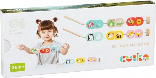Il set in legno per bambini Cubika “Dove viviamo” unisce apprendimento e divertimento. I bambini cercano le coppie corrette — animale e sua casa — e le infilano sul cordoncino, allenando in modo naturale la motricità fine e il ragionamento logico. I pezzi sono colorati, robusti e piacevoli al tatto.