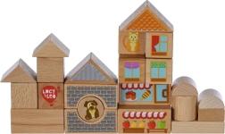 Le stampe colorate con motivi di animaletti, vetrine, finestre e tetti danno vita alle costruzioni e insegnano ai bambini a cogliere i dettagli. Al termine del gioco, tutti i pezzi si ripongono facilmente nel resistente contenitore rotondo con coperchio richiudibile e maniglia, che facilita il trasporto e la conservazione.