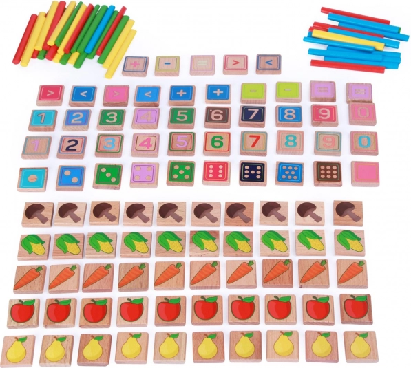 La confezione include cartoncini in legno con numeri, pallini come sui dadi, immagini di frutta e verdura, oltre a segni matematici e bastoncini colorati per contare lunghi 8 cm. I pezzi sono piacevoli al tatto e resistenti per il gioco quotidiano.