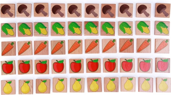 I cartoncini con frutta e verdura sviluppano la percezione visiva, il vocabolario e favoriscono l’associazione e la categorizzazione.